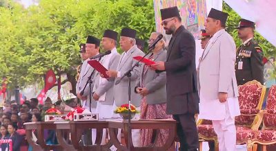 काठमाडौं । नवनियुक्त प्रधानमन्त्री बालेन शाहले पद तथा गोपनीयताको शपथ लिएका छन् । शुक्रबार राष्ट्रपति कार्यालय शीतल निवासमा आयोजित समारोहमा राष्ट्रपति रामचन्द्र पौडेलबाट प्रधानमन्त्री शाहले पद तथा गोपनीयताको शपथ लिएका