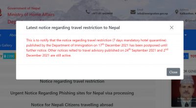 काठमाडौं । कोरोना भाइरसको ओमिक्रोन भेरियन्ट फैलिएका मुलुकबाट नेपाल आउँदा अनिवार्य क्वारेन्टिन बस्नुपर्ने नियम तत्कालका लागि स्थगित भएको छ । अध्यागमन विभागले शनिबार आफ्नो साइटमा सूचना जारी गर्दै शुक्रबारको उक्त