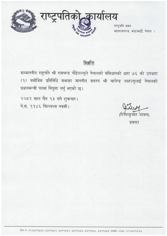 राष्ट्रपति भवन, महाराजगञ्जबाट जारी विज्ञप्तिमा भनिएको् छ, ‘सम्माननीय राष्ट्रपति श्री रामचन्द्र पौडेलज्यूले नेपालको संविधानको धारा ७६ को उपधारा (१) बमोजिम प्रतिनिधि सभाका माननीय सदस्य श्री वालेन्द्र शाहज्यूलाई नेपालको प्रधानमन्त्री पदमा नियुक्त गर्नु भएको छ ।’