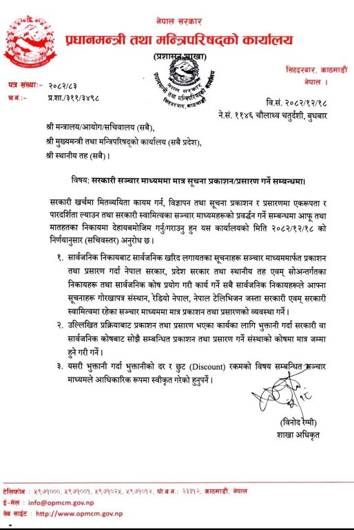 काठमाडौं । नेपाल सरकार, प्रधानमन्त्री तथा मन्त्रिपरिषद्को कार्यालयले सरकारी खर्चमा मितव्ययिता कायम गर्न तथा सूचना प्रवाहलाई एकरूप र पारदर्शी बनाउन सरकारी सञ्चार माध्यममार्फत मात्रै सूचना प्रकाशन तथा प्रसारण गर्न निर्देशन दिएको छ ।