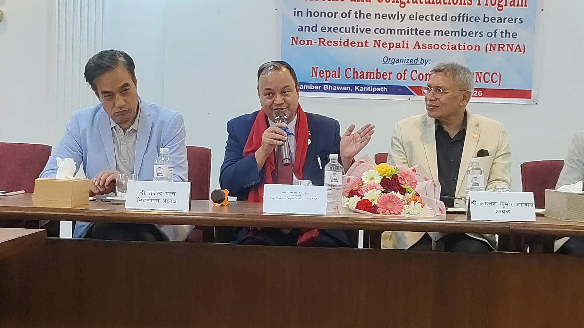 कार्यक्रममा चेम्बरका अध्यक्ष कमलेश कुमार अग्रवालले नेपालको समग्र विकास, व्यापार प्रवद्र्धन तथा अन्तर्राष्ट्रिय स्तरमा राष्ट्रिय पहिचानलाई सुदृढ बनाउने विषय आजको प्रमुख आवश्यकता भएको बताउनुभयो । उहाँले नेपाल प्राकृतिक स्रोत, सांस्कृतिक विविधता र मानवीय सम्भावनाले सम्पन्न भए पनि तिनको प्रभावकारी उपयोग अझै हुन नसकेको उल्लेख गर्नुभयो । अध्यक्ष अग्रवालले रणनीतिक ढंगले स्रोत परिचालन गर्नुपर्नेमा जोड दिदै नेपाल चेम्बर र एनआरएन बीच सहकार्य आवश्यक रहेको बताउनुभयो ।