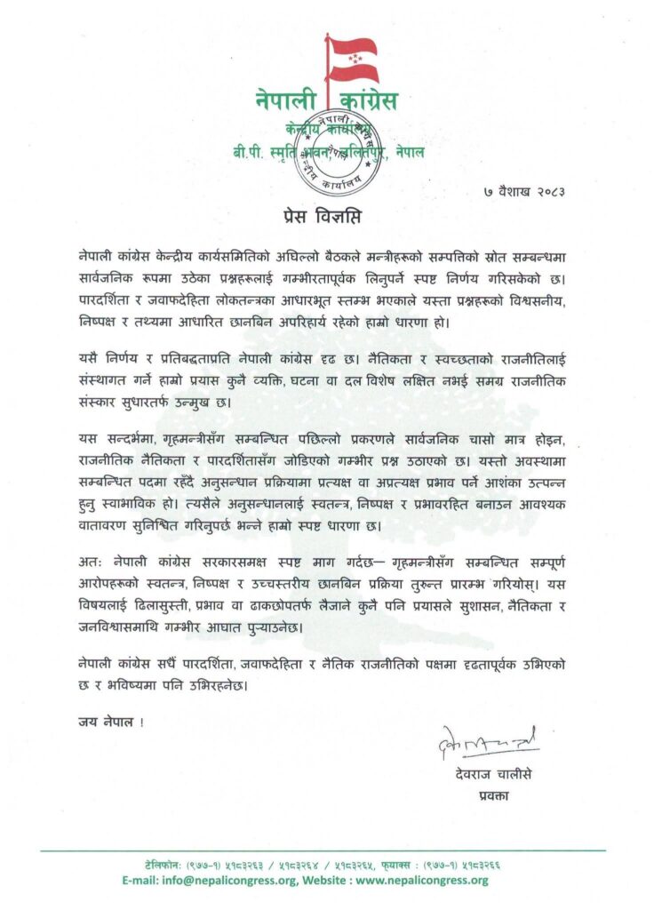 पछिल्लो समय गृहमन्त्रीसँग जोडिएको प्रकरणले सार्वजनिक चासोसँगै राजनीतिक नैतिकता र पारदर्शितामाथि प्रश्न उठाएको कांग्रेसको ठहर छ । यस्तो अवस्थामा सम्बन्धित पदमा रहँदा अनुसन्धान प्रक्रियामा प्रभाव पर्न सक्ने आशंका रहने भएकाले स्वतन्त्र र प्रभावरहित छानबिनको वातावरण सुनिश्चित गर्नुपर्ने आवश्यकता औंल्याइएको छ ।