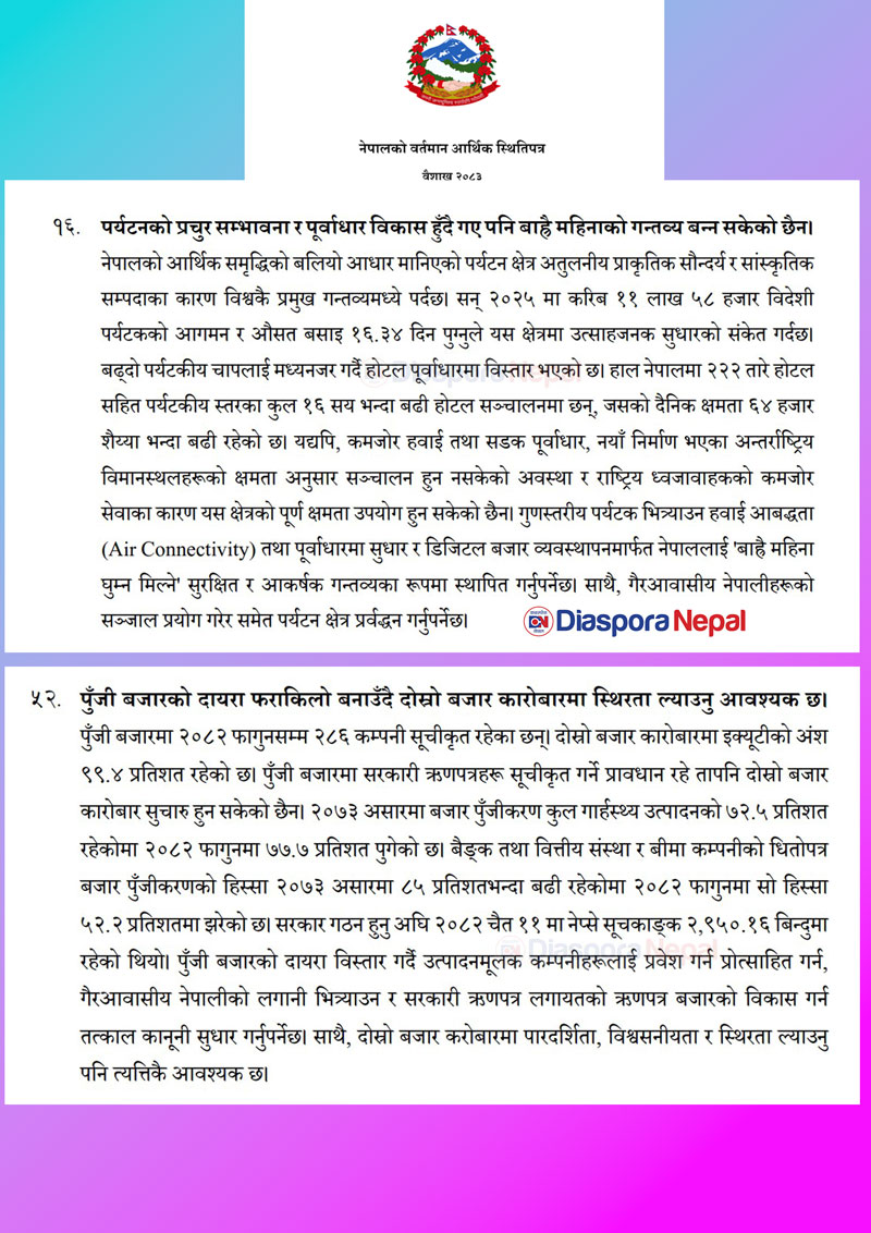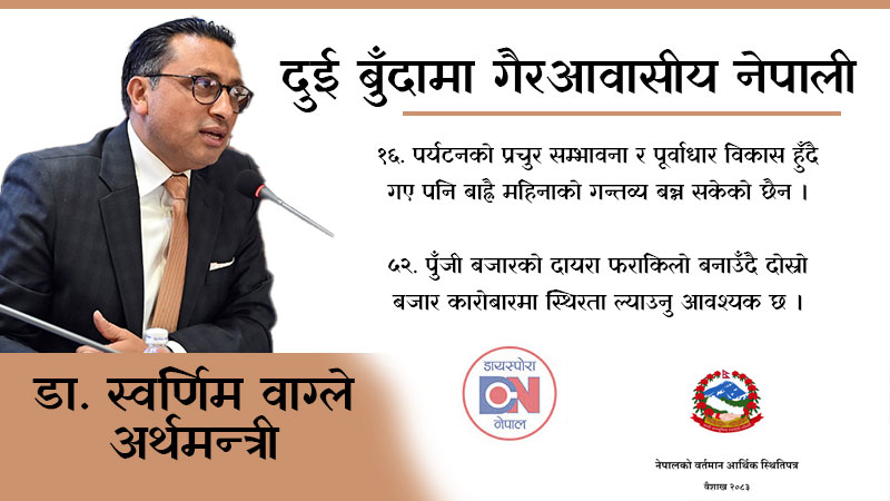 काठमाडौँ । अर्थमन्त्री डा. स्वर्णिम वाग्लेले आज सार्वजनिक गरेको ‘देशको आर्थिक स्थिति पत्र’ ले नेपालको पर्यटन र पुँजी बजारको विकासमा गैरआवासीय नेपालीहरूको सञ्जाल र लगानीलाई प्रमुख आधार स्तम्भका रूपमा प्रस्तुत गरेको छ । नेपाललाई बाह्रै महिना घुम्न मिल्ने आकर्षक पर्यटकीय गन्तव्यका रूपमा विश्वमा चिनाउन गैरआवासीय नेपालीहरूको विश्वव्यापी सञ्जाललाई परिचालन गरी प्रवर्द्धनका कार्यक्रम अघि बढाउनुपर्नेमा स्थिति पत्रले जोड दिएको छ ।