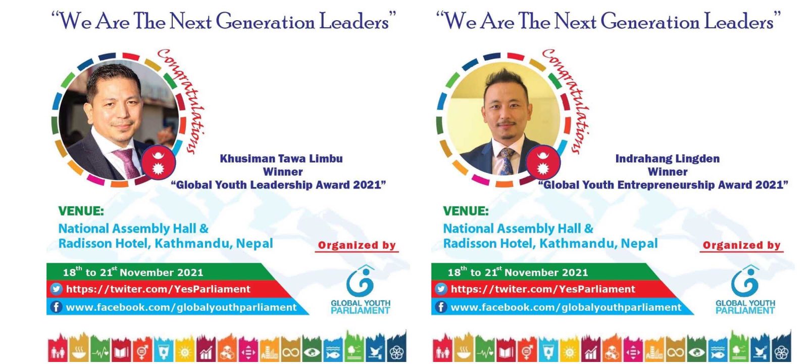 समाजसेवा र पत्रकारितामा विगत १५ बर्षदेखिको सक्रियताका लागि खुशी लिम्बुलाई यस बर्षको ’ग्लोबल युथ लीडरशिप अवार्ड’ तथा अध्ययन, व्यापार र लगानीमा प्राप्त गरेको सफलताका लागि युवा व्यवसायी इन्द्रहाङ लिङदेनलाई ’ग्लोबल युग अन्टरप्रन्यर अवार्ड’बाट पुरस्कृत भएका छन । युवा ब्यापार व्यावसायी इन्द्रहाङ लिङदेन बेलायतको सत्तारुढ कञ्जरगेटिभ पार्टीको फेल्थाम क्षेत्रको डेपुटी चेयरम्यान पनि हुन् ।